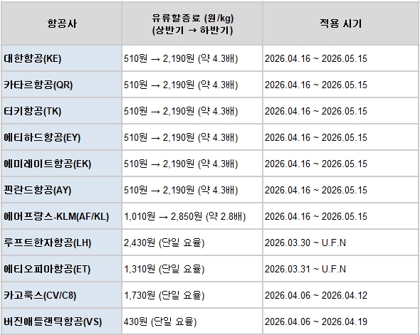대한항공의 경우 4월 16일부터 기존 약 KRW 510/kg 수준에서 KRW 2,190/kg까지 인상될 예정이며,