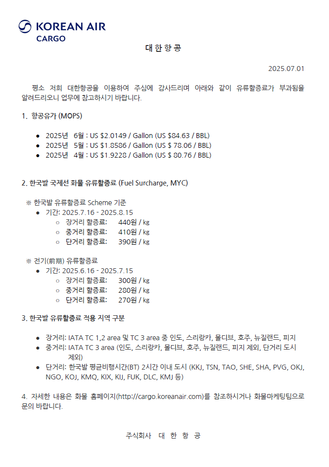 한국발 국제선 항공화물 유류할증료 요율 공지 (25년 07월 16일 ~ )